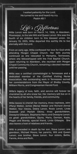 Willa Clara Lenoir will be remembered for her gentle spirit, her nurturing nature, and the lasting impressions she left on all who had the privilege of knowing her. She lived with grace and dignity, qualities that will continue to inspire those she leaves behind. Her presence will be deeply missed, yet her spirit will forever remain in the hearts of her loved ones.